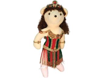 Even though Christine is part of the chorus of Hannibal she definitely stands out from the crowd in this red and green slave girl costume. Starting from her feet, we begin with a pair of handmade, silky pink toe shoes that tie around trim ankles with pink satin ribbons. Traditional “ballet pink” tights are topped off with custom-dyed, green velvet briefs. The same green velvet is used alternately with custom-dyed red velvet to create the parti-colored corset that gives our bear the perfect “hourglass” figure that any Victorian woman would envy. To trim this tiny replica nearly 5,000 glass, crystal and gold metal beads were hand strung to create not only the skirt, but the bodice and arm trim as well. Around the hips, a heavy gold braid creates a girdle effect which sets off the tiny gold braid vertically taping all the corset seams. These front and back seams are then accented with tiny red and green cabochon stones rim-set in gold. All the jewelry was handmade with as much attention to detail as the originals. Small metal findings are encrusted with beads and Swarovski crystal rhinestones to recreate the look of the original costume design. These accents are seen not only as bracelets and a tiara but also as brooches on the bodice’s center front, lower front and back details. Christine’s signature mane of spiral, chestnut brown curls is her crowing glory as she is ready to take on the role of a leading lady. Carlotta, stand back!