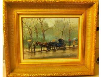 "Embellish your home with this ravishing painting. This vivid painting will put a smile on your face every time you see it. “Blue Carriage” simply portrays a horse-drawn carriage on a rainy day surrounded by people carrying their colorful umbrellas. This most exquisite painting is fit for any home, so bring it into yours.