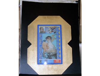 A hand-carved wooden frame in the shape of the figure eight surrounds this commemorative poster of Michael Phelps and his eight Olympic gold medals. The frame measures 40" X 28" with an acid-free mat all under glass and ready to hang.