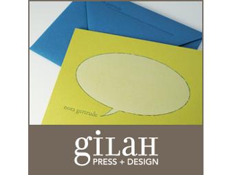 One hundred note cards and envelopes handprinted on a letterpress from the late 1800s. The winner's name will be printed on one of many existing designs; envelopes will be printed with the winner's return address. Many colors from which to choose.