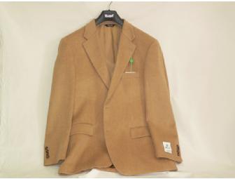 Men's size 42 Regular, two-button Haspel sport coat in a beautiful shade of camel. Traditionally tailored with back center vent and made of 100% camel hair fabric.
