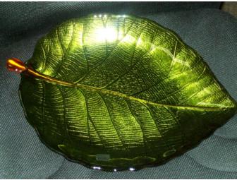 Beautiful shimmering green leaf plate, backed in a gold color. Size: 16" X 11 1/2"