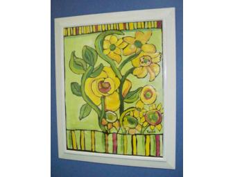 A white framed painting of yellow flowers with other fun colors to brighten your room.