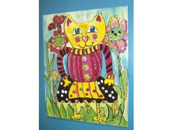 A creative kitten with a fun smile. The colors will bring light and excited to your room. It is on canvas and 24 x 30 inches.