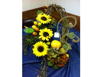 Enjoy this beautiful grapevine oval wreath embellished with sunflowers, mini squash, hydrangea and assorted greens. This lovely wreath would enhance the home of anyone.