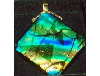 Stunning blue and green pendant by Susan M. Sablon. This pendant measures 2" x 2" and is a dichroic pendant with an 18k gold plate neck chain (18 inches).