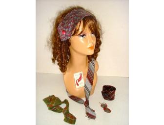 Lorraine Walker has artistically taken vintage ties and made them into smashing new accessories. This collection includes a hairband, lanyard, cuff bracelet, keyfob, and dog collar with pouch for a most discriminating pet. These items are eco-friendly, fun, and fashionable!