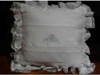 This exquisite shadow work pillow is made with Swiss batiste, lace insertion, entredeux and pintucks with gathered lace batiste ruffle. White pillow with pale blue and pink embroidery. Pillow also includes three antique pearl buttons.