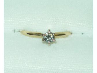 This traditional diamond solitaire engagement ring, size 6 1/2, is .25 carat in a 6-prong white gold setting. The band is 14K gold. This exquisite ring just shines!