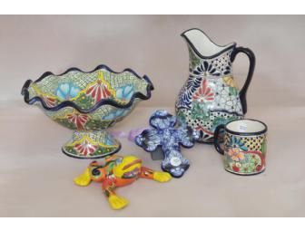 Imported by NCS parent Karen List, this beautiful Mexican pottery would be an asset to any outdoor or indoor entertainment area. This grouping includes a large water pitcher, coffee mug, large scalloped fruit bowl, small decorative frog and blue cross. It is beautiful and makes a great gift.