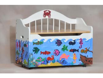 What home is complete without a storage chest or toy box! The background of this fun and lively chest was painted by North Cross Senior Tyler Bailey. Then each kindergarten student hand-painted a sea creature, which is secured to the chest to complete the whimsical underwater theme. This is a great item for storing toys and books or to enhance any bedroom or playroom. This is a sturdy piece of furniture that is constructed of wood and can be passed down from generation to generation.