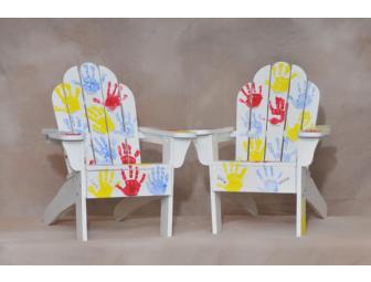 What says relaxation and family time enjoyment like Adirondack chairs sitting on a porch? Imagine seeing your child sitting in one of these sweetly decorated chairs and having that memory for years to come. These two child-size chairs include the handprint of each child in the JK-4 class with their name listed below their handprint. Bid now and don't miss out on this precious addition to your home.