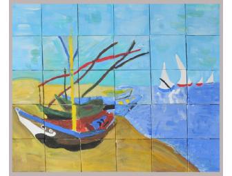 This painting is a copy of Van Gogh's Fishing Boats on the Beach at Saintes-Maries, 1888. Each fifth grade student lent their talents to this unique piece of art, which is composed of thirty individual squares, by painting a square to complete this master work. This painting would be lovely in either a formal or casual room. What a great piece of art that emphasizes the importance of teamwork and childhood bonds.
