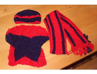 Stay toasty warm in this hand-made scarf, wrap, and hat made with love by Brock's grandmother.