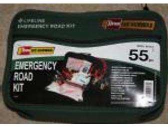 This 55 piece Emergency Road Kit includes - jumper cables, flashlight, glaves, poncho, whistle, phillips and flat-head screwdrivers, duct tape, utility knife, shop cloths, cable ties and first aid supplies.