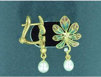 18karat yellow gold pair of Omega back earrings. Approx Length (including pearl): 1-1/8" (28.43mm), Width: 5/8" (14.56mm), Depth 1/16" - 9/16" (1.05mm-12.79mm), Weight: 6.40 gram. There are 2-(1.35mm) (.02 carats)brilliant round diamonds bezel set, 2-(2.20mm) brilliant round diamonds bezel set, and 2-(6.41mm x 5.64mm) white freshwater pearls. This piece has heat fired enamel in blue, blueish green, and pink.