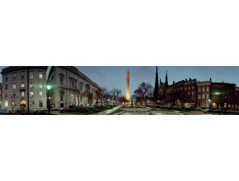 This panoramic color photograph features a magnificent view of Mt. Vernon Place. It is a 30" chromagnetic print matted, mounted, framed, and signed by the artist. Perfect for your home, office, or for a Baltimorean living in another city who might need a beautiful reminder of home.