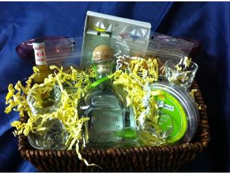 A south of the border experience filled with 2 margarita glasses, stirrers, 6 shot glasses, hot sauce, salt for rimming, 2 pouches of spicy snack mix and nuts, and 1 bottle of Silver Patron.
