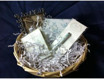 Sweet basket with a beautiful silver frame with light blue accent crystals, journal, note cards and matching pen in a light floral print..perfect for friends.