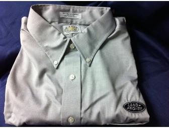 Mens 18 1/2 34x35 grey button down oxford style shirt with Landrover logo.
