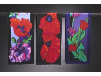 The winning bidder will receive a hand painted silk scarf by Mary Sly. The artist writes: "Every one of my colorful, hand painted scarves, are made, one at a time. I freehand my designs directly onto the heavy, luxurious, long lasting 100% silk charmeuse fabric, then paint that design with fabric dyes. Each individually painted floral has bright, bold colors, is steam set, and hand washable. Size is approximately 9"x54". You get to select from my inventory of these scarves when you pick up your item."