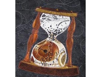 This one of a kind beaded applique handmade messenger back in black and features time in an hour glass.