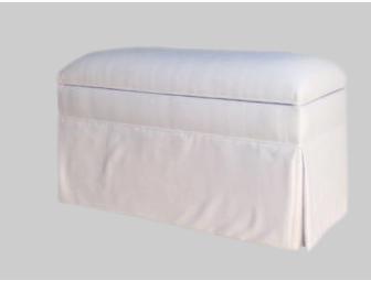 Multipurpose skirted storage bench in vanilla twill. Well-suited for a hallway, linen closet or bathroom. This storage bench is a perennial favorite as a wedding gift. 36" Length, 22" Height, 18" Depth.