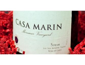 The winning bidder will receive one bottle of 2005 Casa Marin Syrah. This is one of the finest wineries in Chile. Located in Miramar Vineyard at the top of the hill facing the ocean. Cold temperatures and early morning fog are very prevalent during winter and spring. Deep black cherry color. Comples aromas reminiscent of ripe red berries, spices like anise, white pepper and black licorice in harmony with mocha and toasty aromas. Well balanced palate with good structure and soft tannins. Pleasing with an agreeable finish.