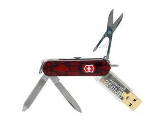 This package is for a Swiss Army Victorinox Knife offered by Bonds House of Cutlery. The Swiss Army Knife comes complete with 256MB memory stick; plugs right into computer's USB port. Great way to copy and transport digital pictures, music, and data files. Contains requisite stainless-steel blade, scissors, nail file, screwdriver, and key ring. Includes LED mini-light and a retractable ball point pen; handy for working in darkness. Compatible with Windows, Mac OS, and Linux; gold-plated contacts ensure outstanding dataflow.