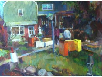 This 30" X 40" unframed oil painting on canvas is from the series "Grandma's House" completed in 2008. This painting depicts a garage sale outside of the artist's grandmother's house in suburban Long Island. The title "Curb Alert" refers to the subject line of certain 'craigslist.org' postings, which alert readers to unwanted items left at the curb either for salvage or for trash pick-up. Ms. Wilson received her Bachelor of Fine Arts at Maryland Institute College of Art and has many honors and awards.