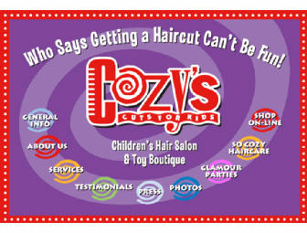 Who says getting a haircut can't be fun? At Cozy's Cuts for Kids your child will have a fantastic time getting their new "do". Their experienced hairdressers specialize in children's hair and helping kids enjoy the whole experience. The fun chairs and toy store environment only add to the adventure. Your child will thank you for it and look cute to boot.