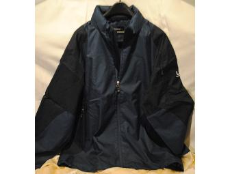 Dark blue Port Authority brand rain jacket with velcro sleeves, 3 exterior zip pockets( 1 on sleeve), 1 interior zip pocket, double zipper closure, concealed hood, white University Credit Union logo on sleeve, size Men's 2XL only.