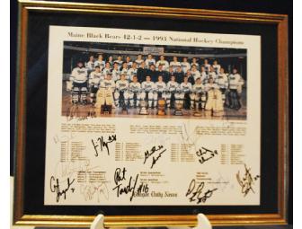 Framed photograph of the 1993 men's hockey championship team featuring signatures of the players. Measures approximately 11.5 x 14.5 inches.