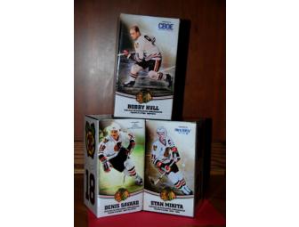 Collection of Three Black Hawk Bobble Heads: Bobby Hull, Stan Mikita, Denis Savard