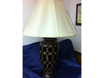 Beautiful ceramic ginger jar style lamp with black and beige and gold accents and cream shade with rope banding around the edge.