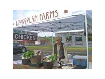 Kookoolan Farms is a diversified small farm in Yamhill, Oregon, now in its sixth year of operation. One of only a handful of small farms in the state with licensed, inspected, on-farm poultry processing, they pasture-raise heritage breed chickens for meat and eggs; and offer pasture-raised beef, pork, venison and lamb; heirloom Red Bourbon breed turkeys for Thanksgiving only; and have occasional other gamebirds such as pheasants, ducks and geese. Our pasture-raised chickens are available at all New Seasons Markets, fresh weekly April through October.