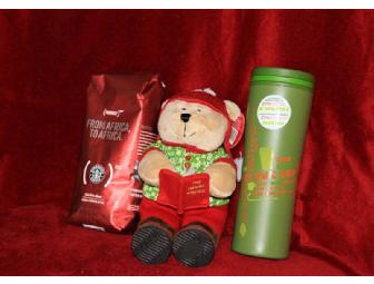 Includes: The Mouse Writer Bearista, 1 lb of East Africa Blend/Citrus and Brown Spice Coffee, and Starbucks tumbler with lid.