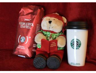 Includes: The Mouse Writer Bearista, 1 lb of East Africa Blend/Citrus and Brown Spice Coffee, and Starbucks tumbler with lid.