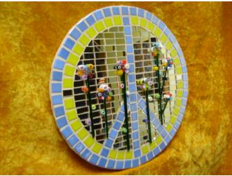 By Jan Miller. 18" diameter. This beautiful piece symbolizes Peace- 24 hours a day. In the daylight, the piece is a shining example of Peace. In the night, the blue tiles light up to reflect the same.
