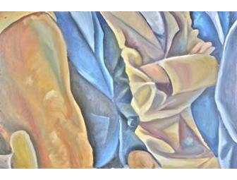One of 72 segments which comprise a "Texas-sized" reproduction of the dramatic “Reading of the Texas Declaration of Independence” by artists Charles & Fanny Normann, originally created for the Texas Centennial Celebration in 1936. The painting memorialized the work of the fifty-nine elected delegates at Washington-on-the-Brazos who declared Texas independent from Mexico in 1836. The image was divided into 72 segments, then numerous local artists, both professional & amateur, were assigned a segment of the image to paint on a 2 X 3 ft. panel. These segments were assembled onto an 18 X 24 ft. grid to create an impressive reproduction of the painting, three times its original size. This one-of-a-kind item was unveiled for the 175th anniversary of the signing of the Texas Declaration of Independence.