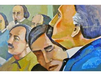 One of 72 segments which comprise a "Texas-sized" reproduction of the dramatic “Reading of the Texas Declaration of Independence” by artists Charles & Fanny Normann, originally created for the Texas Centennial Celebration in 1936. The painting memorialized the work of the fifty-nine elected delegates at Washington-on-the-Brazos who declared Texas independent from Mexico in 1836. The image was divided into 72 segments, then numerous local artists, both professional & amateur, were assigned a segment of the image to paint on a 2 X 3 ft. panel. These segments were assembled onto an 18 X 24 ft. grid to create an impressive reproduction of the painting, three times its original size. This one-of-a-kind item was unveiled for the 175th anniversary of the signing of the Texas Declaration of Independence.