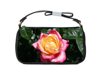 BEAUTIFUL LEATHER HANDBAG made from my own Photography. 10.5" x 5.75" x 1.75". Zipper top; zipper exterior pocket; 2 open + 1 zipper interior pockets. Photo panel is durable, washable nylon; rest of bag is leather. 'Peace & Love' Rose, that I photographed last summer in Hartford's Elizabeth Park Rose Garden. STYLISH, FUNCTIONAL ART...