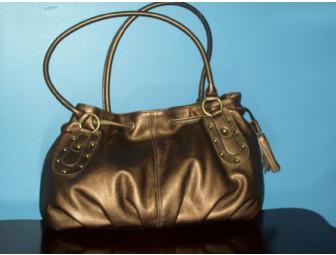 Large, copper colored purse with 2 handles and many pockets inside. Draw sting top and snap closure. Man made material.