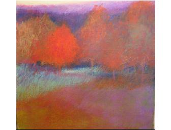 This acrylic and wax pastel landscape is painted on a 12"x12"x1.5" canvas. The work is done in intense, fall colors celebrating the beauty of fall colors as seen in the rolling hills of Ohio.