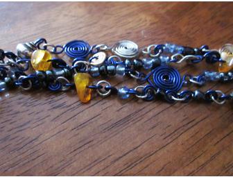 Enjoy this beautiful multi-strand hand-crafted necklace featuring blue, aqua, silver and gold plated wire, amber ships, metal beads, assorted blue stone and acrylic beads. Everything is hand twisted and the clasp is hand-made as well. Total length from clasp to clasp is 26 inches. Hand crafted by the donor.