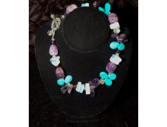 Exciting is putting it mildly. Mary Catherine has managed to dazzle us yet once again with this outstanding original piece of MCS jewelry. This necklace, expertly crafted, features her big uniques trademark of quality colored stones represented in brilliant turquoise, amethyst and crystal. Sure to please any girlfriend, big time!