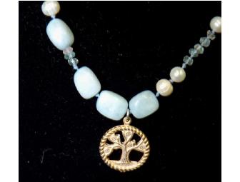 Exceptional quality accompanied by skillful design only begins to describe this remarkable pair of pieces. The outstanding aquamarine faceted and tumbled stone necklace with pearls is strung on silk, secured and accented by a sterling clasp and frosted bronze pendant. This piece is enhanced by the exquisite and similar design of coordinating earrings. This necklace and earring set is sure to please!
