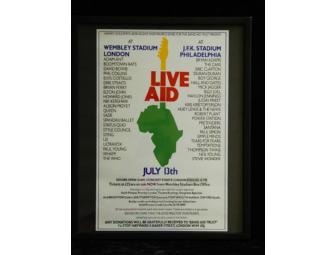 Remember "We Are World"? This Live Aid lithograph reproduction poster for the legendary concerts at London's Wembley Stadium and Philadelphia's JFK Stadium on July 13, 1985 was the greatest music event in history. Measures 12.5" x 19.25". In mint condition. If you love the best music, then sport this tubular t-shirt (Size M) to boast your blasting jams!