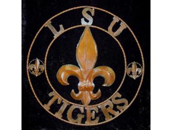 Rustic LSU Tiger fleur de lis wall plaque. This round design is three feet in diameter and will look tubular in any Tiger room! 34" in diameter.