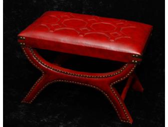 Maroon leather ottoman will add flair and style to any room. Features nailhead-studded trim and imprinted design on top.